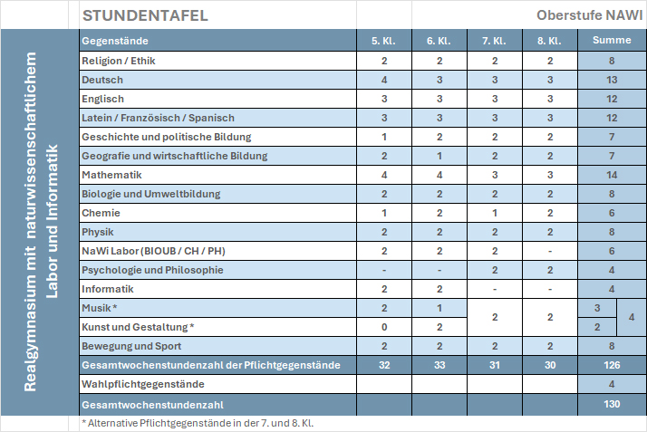 Der NaWi-Zweig bietet eine fundierte, naturwissenschaftliche Ausbildung mit vertiefendem Unterricht in Biologie, Physik, Chemie und Informatik. Er fördert praktisches Arbeiten, Teamfähigkeit und Problemlösungskompetenz – wichtige Grundlagen für Studium und Beruf im naturwissenschaftlich-technischen Bereich.